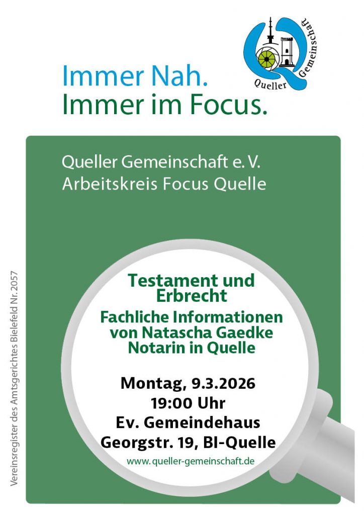 Quelle. Wegen der großen Nachfrage bietet die Queller Gemeinschaft einen zweitenAbend zum Thema „Wie regle ich meinen Nachlass“. Einen fachlichen Überblick über denThemenbereich Testament und Erbrecht gibt Natascha Gaedke, Notarin im Ortsteil Quelle, amMontag, 7. März, ab 19 Uhr im Evangelischen Gemeindehaus der Johannes-Kirchengemeinde,Georgstraße 19, im Ortsteil Quelle. Testament, Erbvertrag oder doch lieber eine Schenkung zuLebzeiten? Es gibt einige Möglichkeiten seinen Nachlass zu regeln. Wie läuft eine Erbschaftüberhaupt ab und auf was kommt es beim Erben und Vererben an? Mit der eigenenSterblichkeit möchte man sich im Alltag eher nicht beschäftigen. Für ein mögliches Erbe anNachfahren, weitere Personen oder Instanzen ist dies jedoch sehr wichtig und erleichtertbürokratische und mögliche juristische Schritte. Mit einem geregelten Erbe kann man zudemberuhigter in die Zukunft sehen. Der Info-Abend ist Teil der Focus Quelle-Reihe der QuellerGemeinschaft und steht allen Interessierten kostenfrei offen.