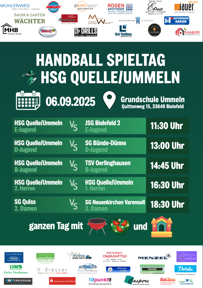 ![]() Von der HSG Quelle/Ummeln e.V. (Handball und mehr in Quelle und Ummeln) findet am 06.09. der erste Spieltag der neuen Handballsaison statt. |
