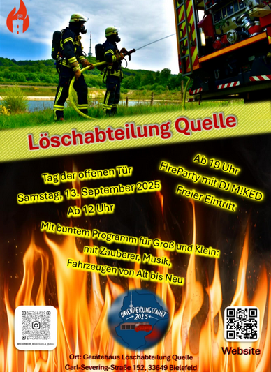 ![]() Es ist wieder so weit: Tag der offenen Tür bei der Feuerwehr Quelle! Kommt vorbei – für Groß und Klein ist immer etwas dabei! Zusätzlich veranstalten wir für verschiedene Feuerwehren eine Orientierungsfahrt 🚒🗺️. Anschließend findet bei uns eine große Party statt – lasst uns zusammen feiern! 🥳 ![]() An allen Mühlenwochenenden ist der Eintritt frei, es gibt frisches Mühlenbrot und Kaffee und Kuchen zu kaufen (solange der Vorrat reicht). Öffnungszeiten sind 14-17 Uhr. Hinweis: am 9.6.2025 keine Bewirtung |
