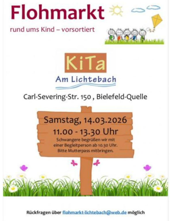 Wir laden euch herzlich zu unserem vorsortierten Kinderflohmarkt am 14.03.2026 von 11 bis 13.30 Uhr in der Kita am Lichtebach ein. Es werden Frühlings- und Sommerkleidung, Umstandsmode, Spiele, Bücher, Fahrzeuge und noch viel mehr verkauft. Eine Cafeteria mit Kaffee und Kuchen gibt es auch.